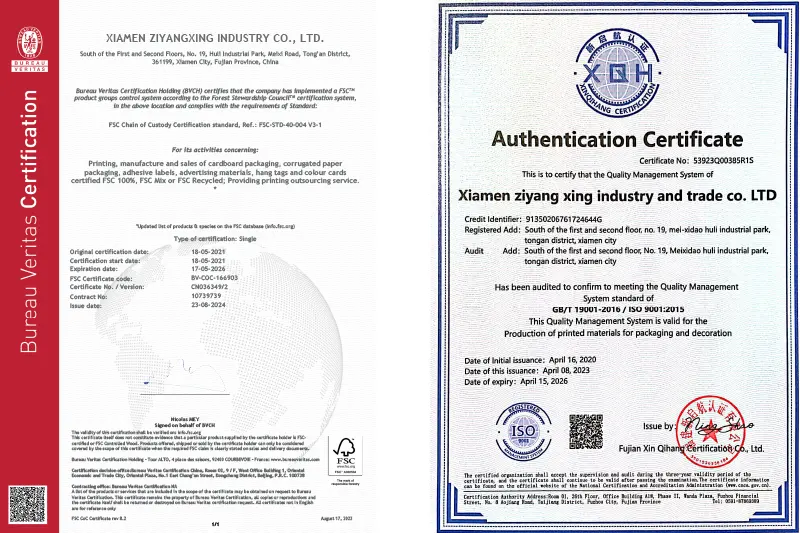 A: vi har FSC, FDA, SGS, VOC og samsvar med miljøbestemmelser som RoHS, 94/62/EC og US TPCH. Vår fabrikk har ISO9001-sertifisering, som en ledende internasjonal emballasjeleverandør og eksportør.
